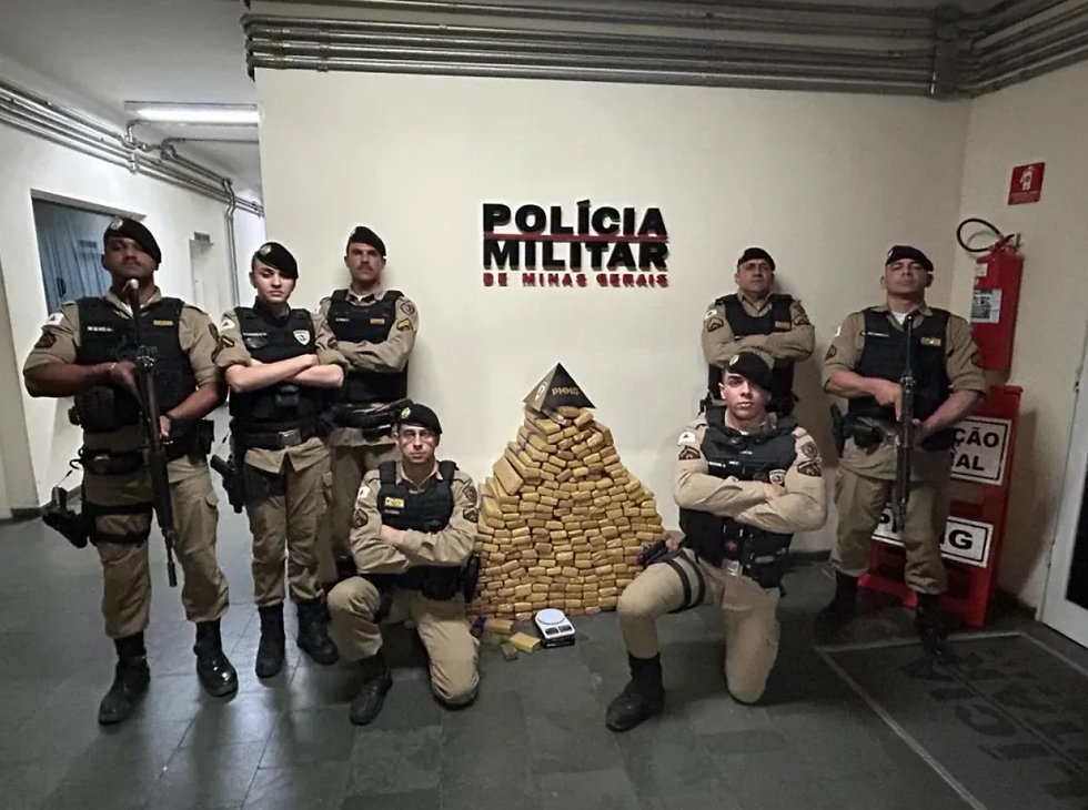 Dentro da residência, os militares abordaram outro suspeito, de 37 anos, que já possuía passagens por tráfico de drogas. Ele confessou que havia entorpecentes no local. Nas buscas, os policiais encontraram 258 barras de maconha, além de sete porções menores, recipientes, uma balança e materiais utilizados para embalar a droga.